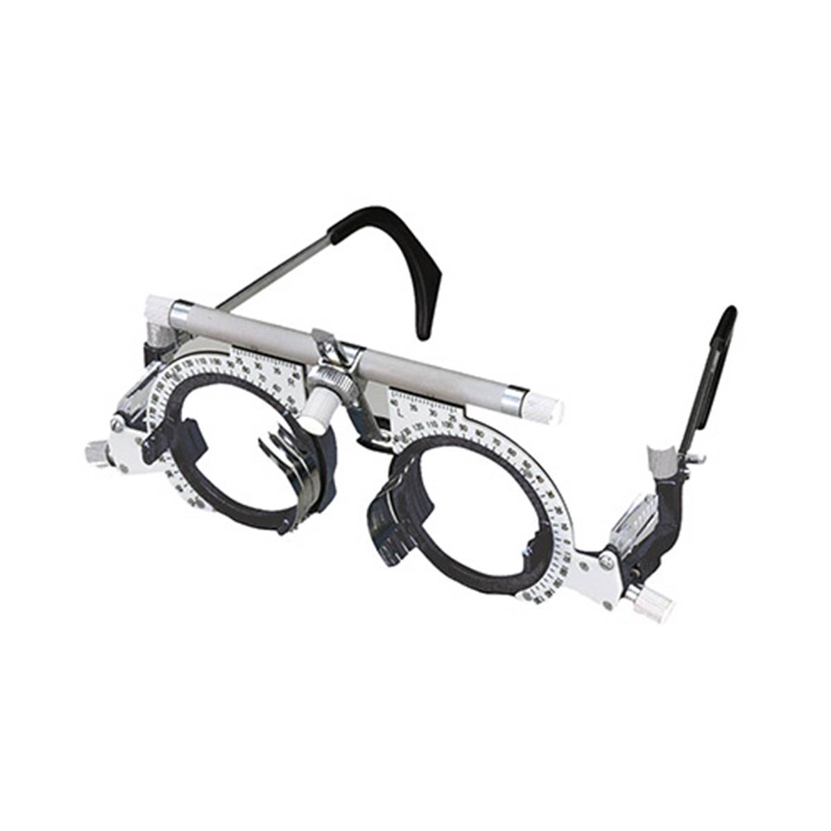 Lunettes d’essai universelles utilisées pour l’examen de vue réfractif et l’adaptation des lunettes. Réglage du nez, de l’axe, des branches et de l’écart pupillaire. Matériel neuf.