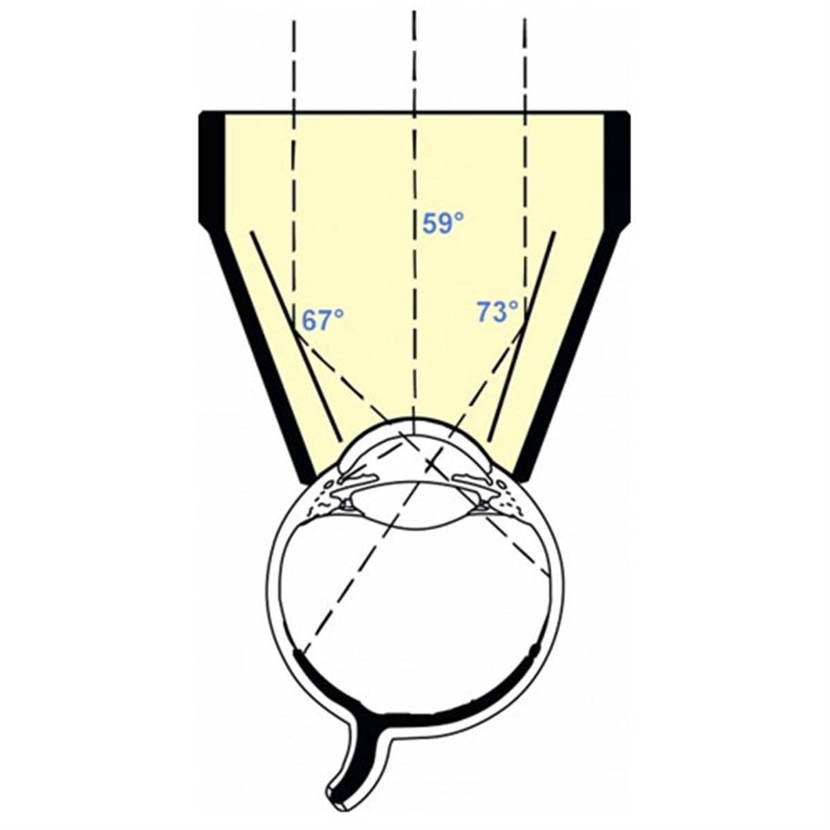 Ce verre classique de type « Goldmann » dispose de trois miroirs inclinés à 59°, 67° et 73° pour permettre la visualisation du fond d'œil et de la chambre antérieure. Le pôle postérieur est vu à travers le centre de la lentille.